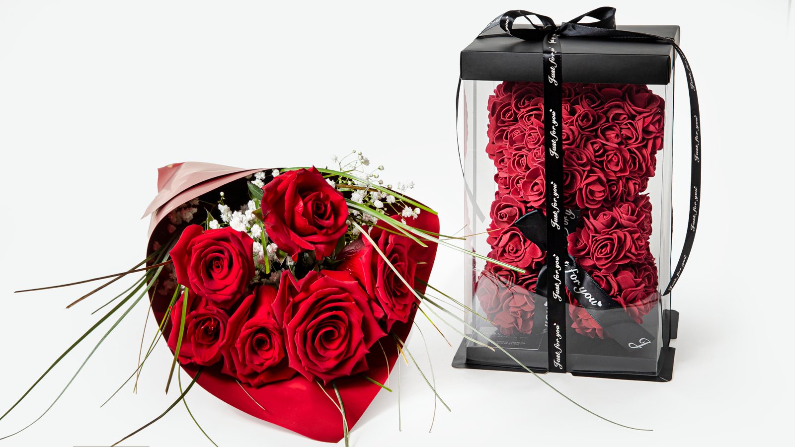 bouquet of 6 red explorer roses , Forever Bear 25cm